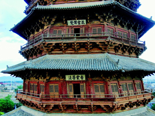 它巍然聳立在晉北廣袤的大地上,有20多層樓高,平面八角形,明五暗四共九層,外觀五層六檐,底層重檐出挑深遠(yuǎn)。全塔有50余種斗拱裝點(diǎn),宛如一朵朵盛開的蓮花,每一明層中心供奉佛像。登塔觀覽,桑干似帶,恒岳如屏。