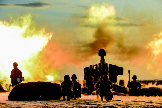 2017年8月25日,第74集團軍某炮兵旅在西北戈壁組織實兵實彈戰(zhàn)術(shù)演習,“志愿軍戰(zhàn)歌連”對“敵”實施火力打擊。新華社資料片
