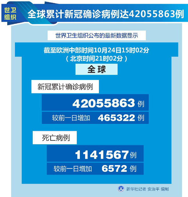 新華社日內(nèi)瓦10月24日電(記者劉曲)世界衛(wèi)生組織24日公布的最新數(shù)據(jù)顯示,全球累計新冠確診病例達(dá)42055863例。