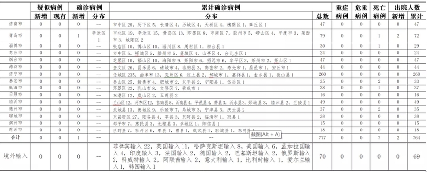 備注:1.山東省本地病例按確診時(shí)醫(yī)院所在縣區(qū)統(tǒng)計(jì),境外輸入病例單獨(dú)統(tǒng)計(jì)。
