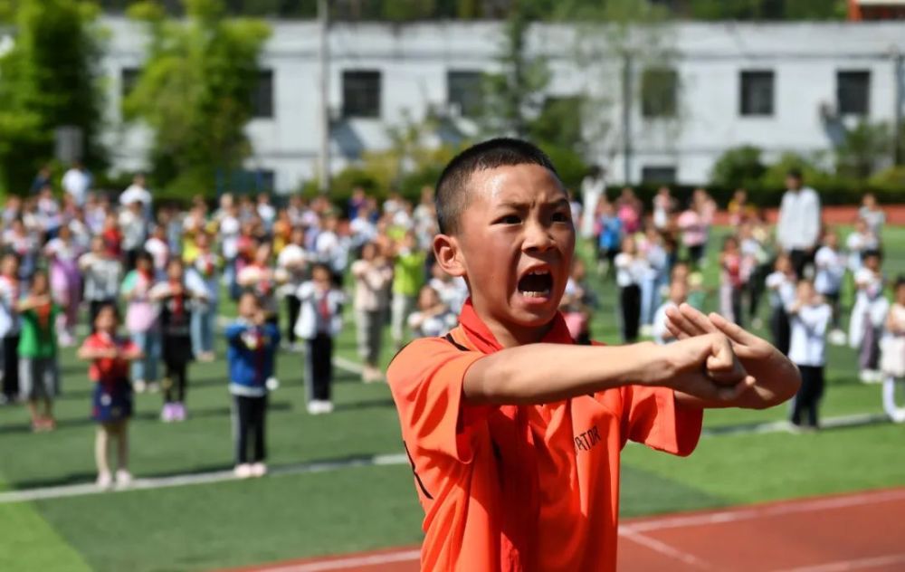 9月8日,在陜西平利老縣鎮(zhèn)中心小學的操場上,學生沈首洋(前)在大課間武術(shù)操上領操。新華社記者 李一博 攝