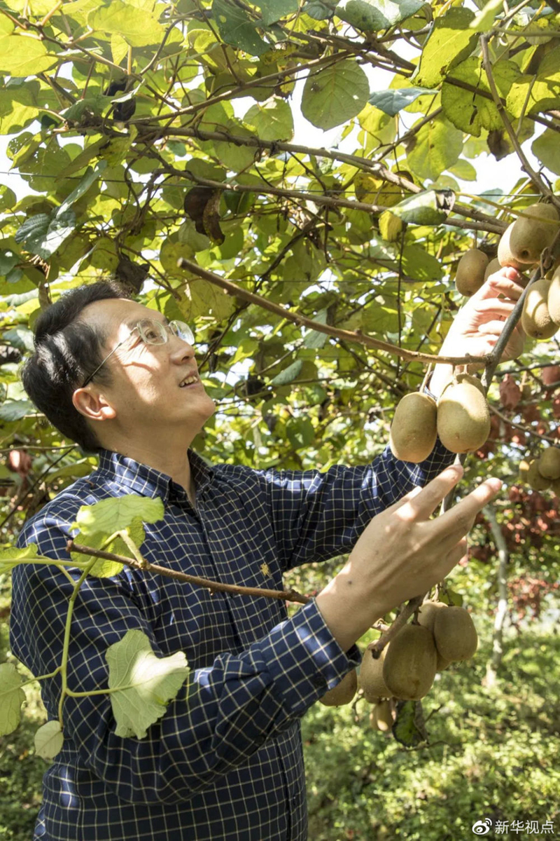 2018年,十八洞村第二任扶貧工作隊長石登高在十八洞村的獼猴桃產(chǎn)業(yè)基地查看獼猴桃長勢 新華社發(fā)