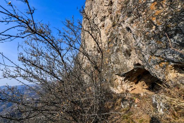 這次路程明顯縮短,但卻十分陡峭。有的路段,我們只能側(cè)著身子,石階僅容一只腳,兩只手只能扒著峭壁,而身后就是懸崖,有時需要雙腿跪著,慢慢挪動身體。由于沒吃、沒喝,嘴唇干裂起皮,開口說話也有點吃力。這樣攀爬一個多小時后,一個山洞進入我們的視野。
