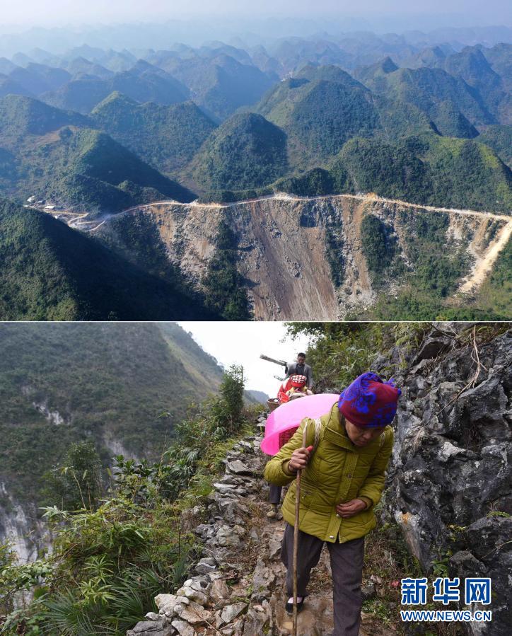 這是一張拼版照片。上圖:已經(jīng)修通水泥路的大化瑤族自治縣板升鄉(xiāng)八好村(2019年11月11日攝,無人機照片);下圖:在尚未通路前,八好村村民背著年貨走山路回家(2016年1月26日攝)。新華社記者 黃孝邦 攝