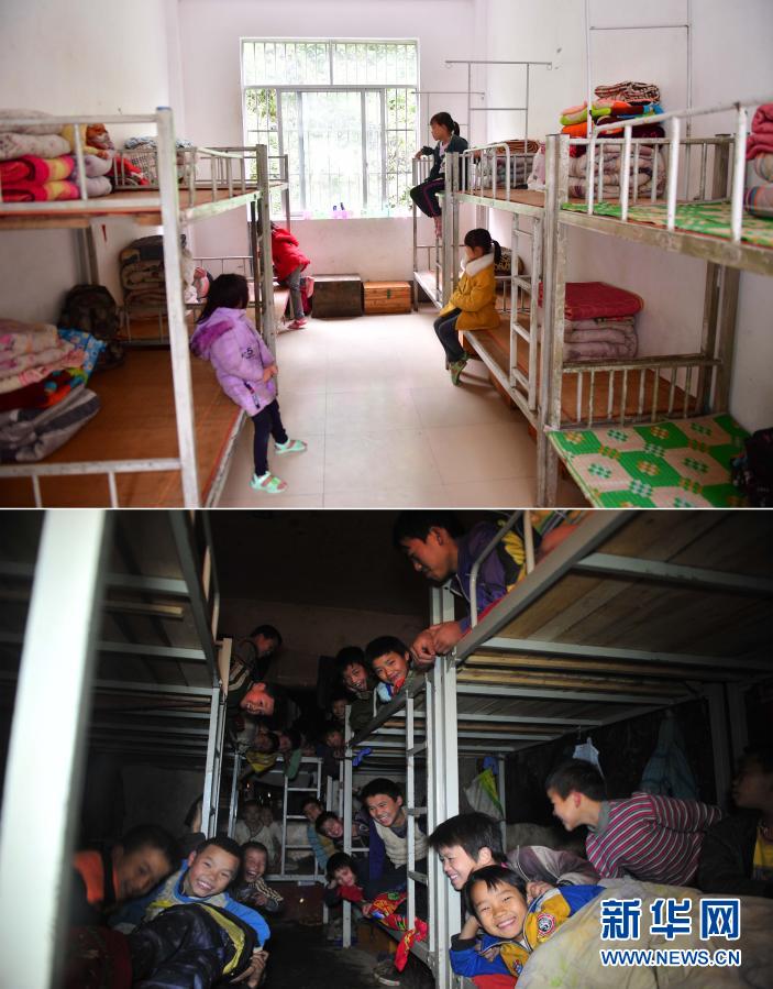 這是一張拼版照片。上圖:在大化瑤族自治縣板升鄉(xiāng)弄勇小學(xué),同學(xué)們在新宿舍里(2019年5月8日攝);下圖: 2012年12月26日,在弄勇小學(xué),同學(xué)們擠在10多平方米的“大通鋪”上準(zhǔn)備睡覺。新華社記者 黃孝邦 攝