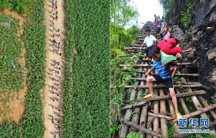這是一張拼版照片。左圖:在大化瑤族自治縣板升鄉(xiāng)弄勇村,孩子們走在放學(xué)路上(2019年5月10日攝,無人機照片);右圖:在弄勇村弄頂屯,孩子們扛著生活用具,爬懸梯上學(xué)(2012年9月3日攝)。目前,弄勇村所有的屯都已告別沒有公路的歷史。新華社記者 黃孝邦 攝