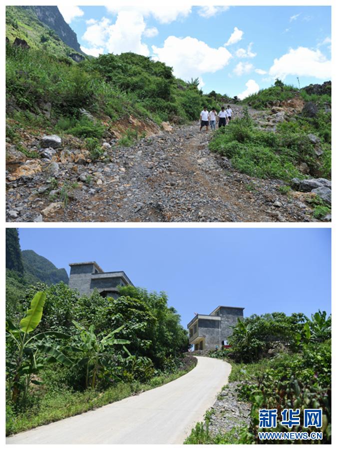 這是一張拼版照片:上圖:廣西那坡縣邊境零公里線上甲柳村上保屯的進屯路(2009年7月14日攝);下圖:甲柳村上保屯現(xiàn)在的道路(2018年6月7日攝)。新華社記者 張愛林 攝
