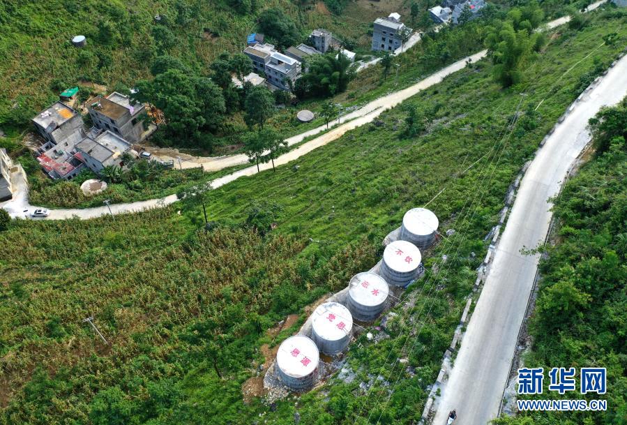 這是廣西都安瑤族自治縣永安鎮(zhèn)安蘭村新建的水柜(7月22日攝,無人機照片)。新華社記者 周華 攝