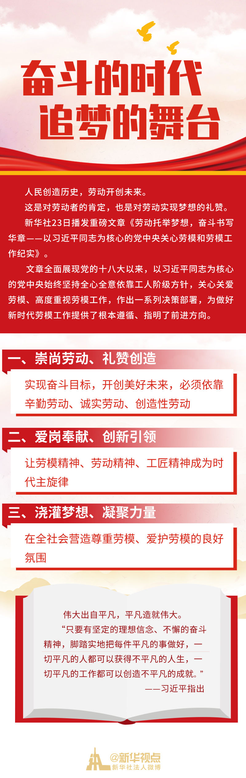 新華社23日播發(fā)重磅文章《勞動托舉夢想,奮斗書寫華章——以習(xí)近平同志為核心的黨中央關(guān)心勞模和勞模工作紀(jì)實》。