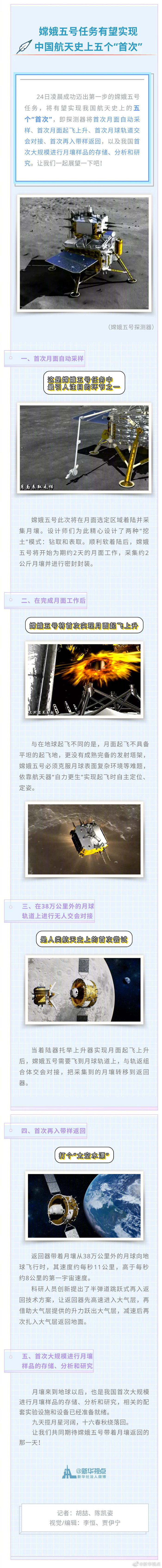 24日凌晨成功邁出第一步的嫦娥五號任務(wù),將有望實現(xiàn)我國航天史上的五個“首次”。看詳情!一起來展望? ????