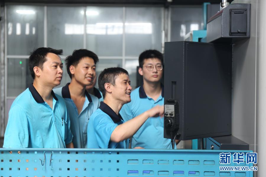 全國勞動模范、寧波中大力德智能傳動股份有限公司設(shè)備科科長萬亞勇(右二)在車間指導(dǎo)員工進(jìn)行數(shù)控機(jī)床故障診斷(8月17日攝)。新華社發(fā)