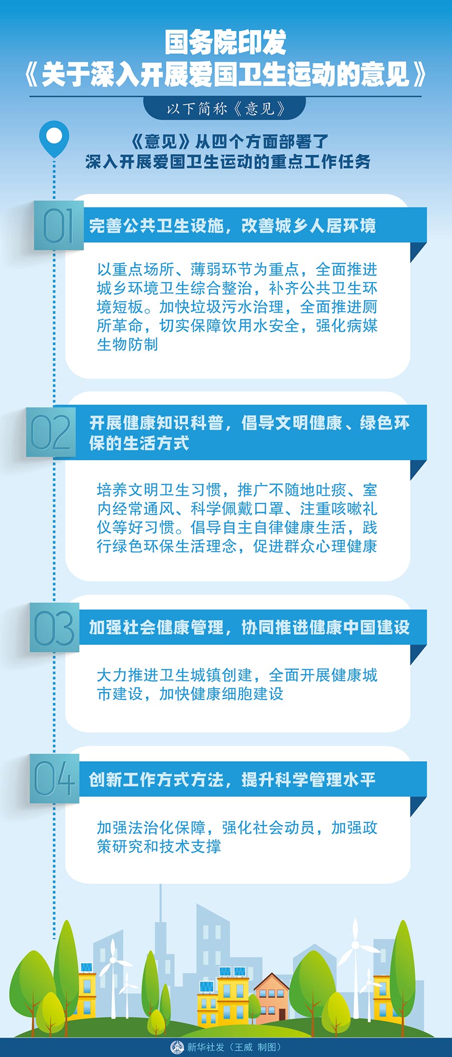 《意見》從四個(gè)方面部署了深入開展愛國衛(wèi)生運(yùn)動(dòng)的重點(diǎn)工作任務(wù)。一是完善公共衛(wèi)生設(shè)施,改善城鄉(xiāng)人居環(huán)境。以重點(diǎn)場所、薄弱環(huán)節(jié)為重點(diǎn),全面推進(jìn)城鄉(xiāng)環(huán)境衛(wèi)生綜合整治,補(bǔ)齊公共衛(wèi)生環(huán)境短板。加快垃圾污水治理,全面推進(jìn)廁所革命,切實(shí)保障飲用水安全,強(qiáng)化病媒生物防制。二是開展健康知識科普,倡導(dǎo)文明健康、綠色環(huán)保的生活方式。培養(yǎng)文明衛(wèi)生習(xí)慣,推廣不隨地吐痰、室內(nèi)經(jīng)常通風(fēng)、科學(xué)佩戴口罩、注重咳嗽禮儀等好習(xí)慣。倡導(dǎo)自主自律健康生活,踐行綠色環(huán)保生活理念,促進(jìn)群眾心理健康。三是加強(qiáng)社會(huì)健康管理,協(xié)同推進(jìn)健康中國建設(shè)。大力推進(jìn)衛(wèi)生城鎮(zhèn)創(chuàng)建,全面開展健康城市建設(shè),加快健康細(xì)胞建設(shè)。四是創(chuàng)新工作方式方法,提升科學(xué)管理水平。加強(qiáng)法治化保障,強(qiáng)化社會(huì)動(dòng)員,加強(qiáng)政策研究和技術(shù)支撐。