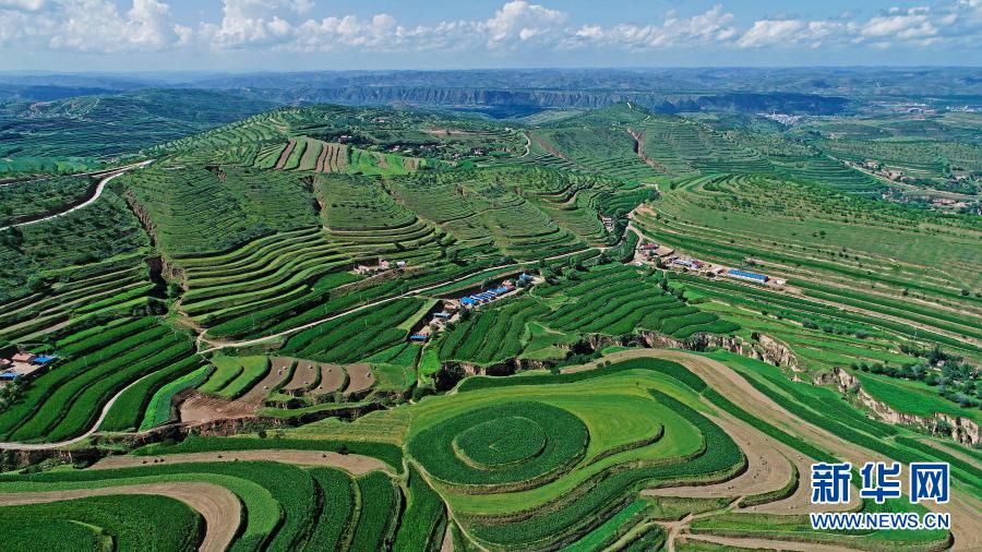 這是2018年7月16日拍攝的寧夏彭陽縣金雞坪梯田公園(無人機(jī)照片)。新華社記者 王鵬 攝
