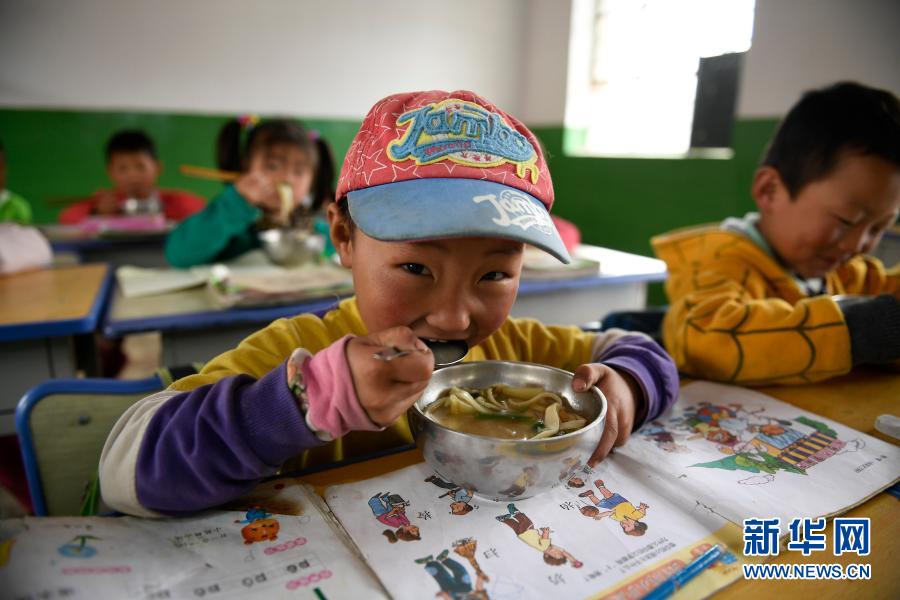 寧夏西吉縣震湖鄉(xiāng)陳岔小學(xué)的孩子在教室吃午餐,學(xué)生每天在學(xué)校有兩頓國家提供補(bǔ)助的營養(yǎng)餐(2017年6月14日攝)。新華社記者 王鵬 攝