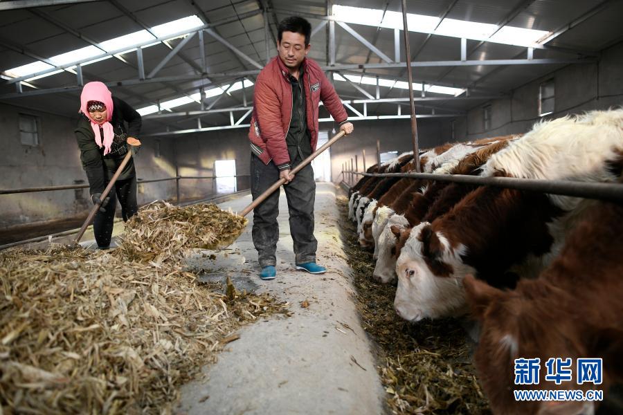 寧夏吳忠市同心縣河西鎮(zhèn)旱天嶺村村民馬國才(右)、馬婷夫婦在村里的養(yǎng)牛合作社喂牛(2017年12月21日攝)。新華社記者 王鵬 攝