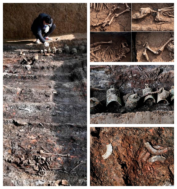 左圖為工作人員在清理河南洛陽(yáng)徐陽(yáng)墓地標(biāo)號(hào)為M15的墓葬;右上圖為河南洛陽(yáng)徐陽(yáng)墓地標(biāo)號(hào)為M15的墓葬周邊祭祀遺存內(nèi)出土的動(dòng)物遺?。挥抑袌D為河南洛陽(yáng)徐陽(yáng)墓地標(biāo)號(hào)為M15的墓葬出土的編鐘;右下圖為河南洛陽(yáng)徐陽(yáng)墓地標(biāo)號(hào)為M15的墓葬出土的玉璜