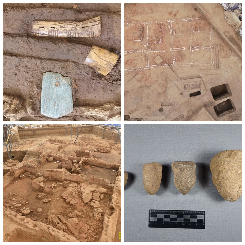 其中,河南南陽(yáng)黃山遺址是一處新石器時(shí)代晚期大型聚落遺址,總面積約30萬(wàn)平方米??脊虐l(fā)現(xiàn)仰韶文化晚期大型“前坊后居木骨泥墻式”建筑3座、工棚式建筑2座,屈家?guī)X文化中小型玉石器作坊址7座、大型夯基1座、墓葬82座、祭祀坑2座、甕棺葬73座,出土大量玉石器制作工具、玉石料殘次品、陶器、骨器等遺物,均與玉石器制作密切相關(guān),推測(cè)黃山遺址應(yīng)為仰韶文化晚期至屈家?guī)X文化時(shí)期大型玉石器生產(chǎn)“基地”性質(zhì)的聚落遺址,為研究新石器時(shí)代晚期南北文化交流、區(qū)域社會(huì)文明化進(jìn)程提供了重要材料。