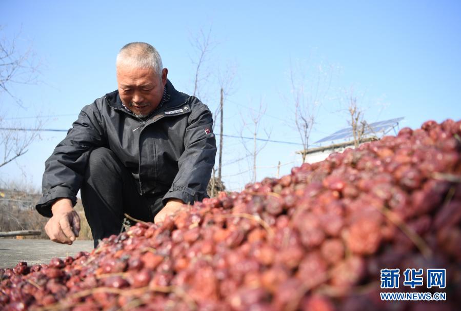 河北省阜平縣東城鋪村建檔立卡貧困戶劉國旗在家中挑揀晾曬的大棗(11月25日攝)。新華社記者 朱旭東 攝