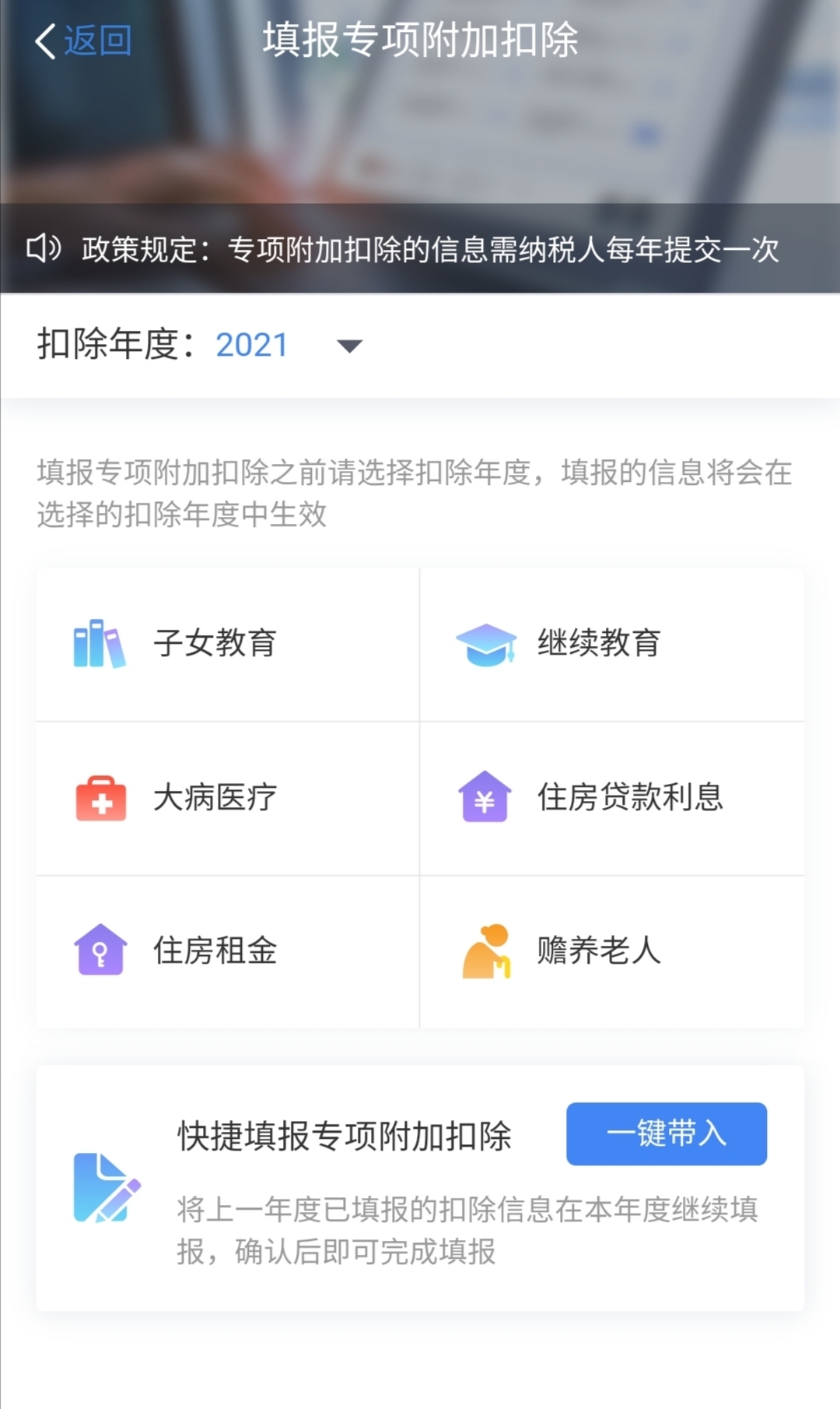 如何確認(rèn)?納稅人從APP首頁進(jìn)入“填報(bào)專項(xiàng)附加扣除”頁面后,既可以選擇一鍵帶入,即將上一年度已填報(bào)的扣除信息在本年度繼續(xù)填報(bào),確認(rèn)后即可完成填報(bào),也可以按目前自身實(shí)際情況逐項(xiàng)填報(bào)。若未及時(shí)確認(rèn),那么已填報(bào)的扣除信息將自動(dòng)視同有效并延長(zhǎng)至2021年。