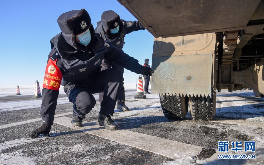 12月15日,內(nèi)蒙古烏蘭察布邊境管理支隊(duì)腦木更邊境派出所民警在主著陸場(chǎng)區(qū)附近檢查來(lái)往車(chē)輛。新華社記者 連振 攝