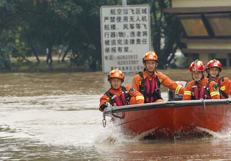 消防隊(duì)員駕駛救援船在被洪水淹沒的城市街巷中巡邏搜救。劉潺 攝