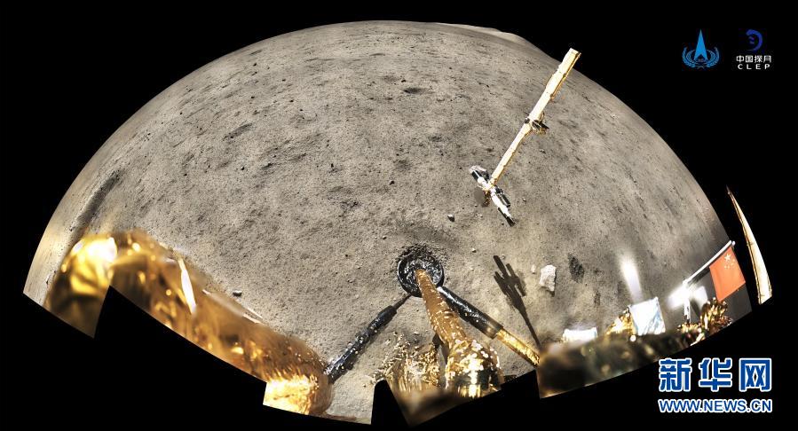 12月4日,國家航天局公布了探月工程嫦娥五號探測器在月球表面國旗展示的照片。嫦娥五號著陸器和上升器組合體全景相機環(huán)拍成像,五星紅旗在月面成功展開,此外圖像上方可見已完成表取采樣的機械臂及采樣器。新華社發(fā)(國家航天局供圖)
