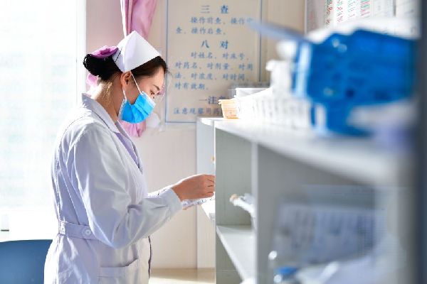 12月16日,海東市第一人民醫(yī)院內(nèi)科護(hù)士劉海婷在藥房取藥。