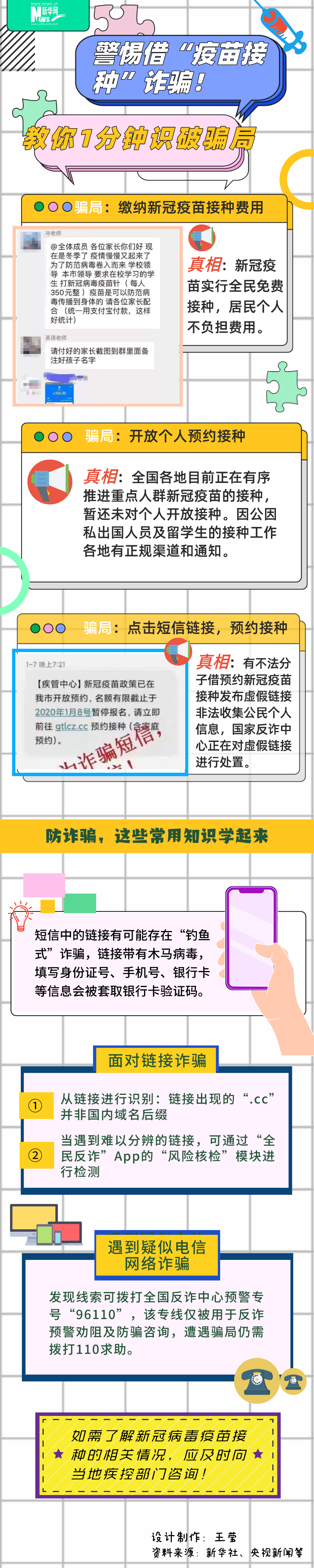 近期,全國多地有序開展新冠病毒疫苗接種,一些不法分子從中嗅到了“機會”,借疫苗接種設局實施詐騙,快來識破這些騙局!