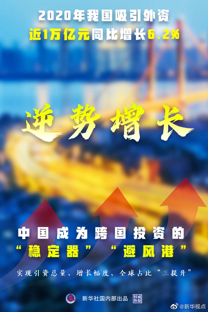 新冠肺炎疫情沖擊下,全球跨國投資大幅下降,中國引資卻逆勢增長。商務部1月20日發(fā)布數(shù)據顯示,2020年我國非金融領域實際使用外資9999.8億元人民幣,同比增長6.2%,實現(xiàn)了引資總量、增長幅度、全球占比“三提升”。中國成為跨國投資的“穩(wěn)定器”和“避風港”。(記者于佳欣)?
