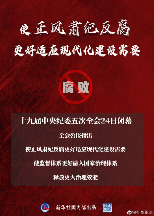 24日,十九屆中央紀(jì)委五次全會閉幕。全會公報指出:使正風(fēng)肅紀(jì)反腐更好適應(yīng)現(xiàn)代化建設(shè)需要,使監(jiān)督體系更好融入國家治理體系,釋放更大治理效能。(記者:朱基釵、孫少龍;海報設(shè)計:朱舜)?