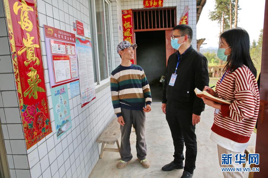 紀(jì)檢監(jiān)察干部向四川洪雅縣中山鎮(zhèn)鄒崗村建檔立卡貧困戶楊德彬(左一)核實(shí)產(chǎn)業(yè)扶貧資金落實(shí)情況(2020年3月18日攝)。新華社記者 江宏景 攝