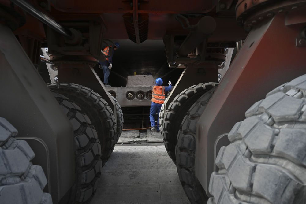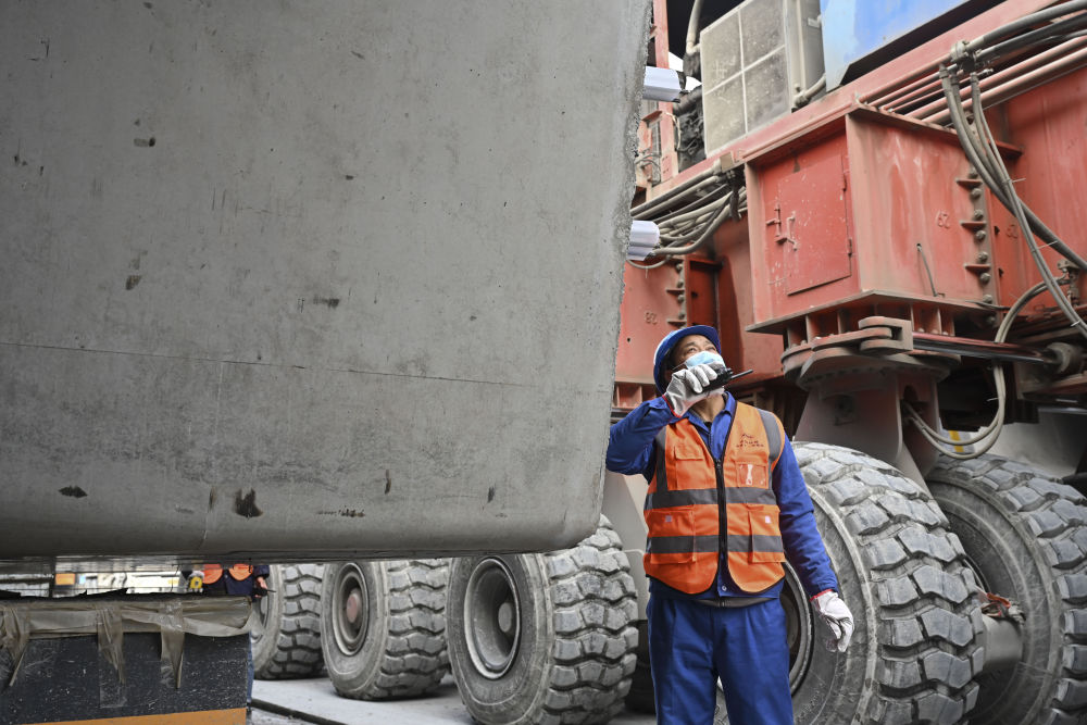 1月28日,杜學(xué)剛(左)和工友在擰緊提梁螺栓。