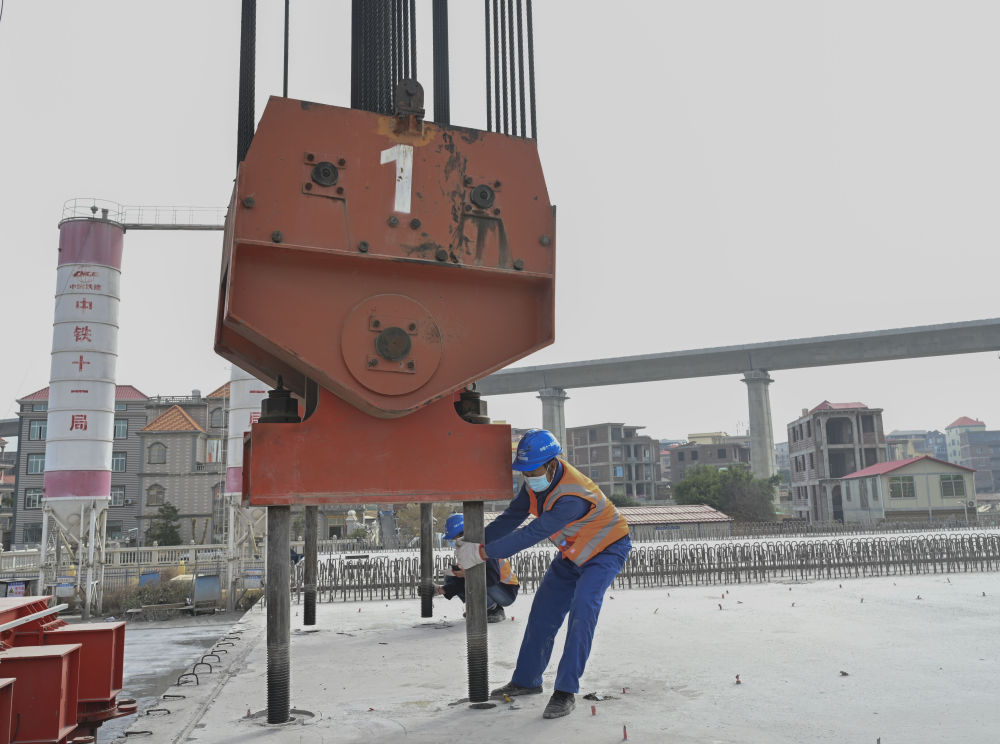 1月28日,在位于福建省莆田市的中鐵十一局新建福廈鐵路4標(biāo)靈川制梁場,河南籍提梁班工人杜學(xué)剛在配合進(jìn)行提梁作業(yè)。