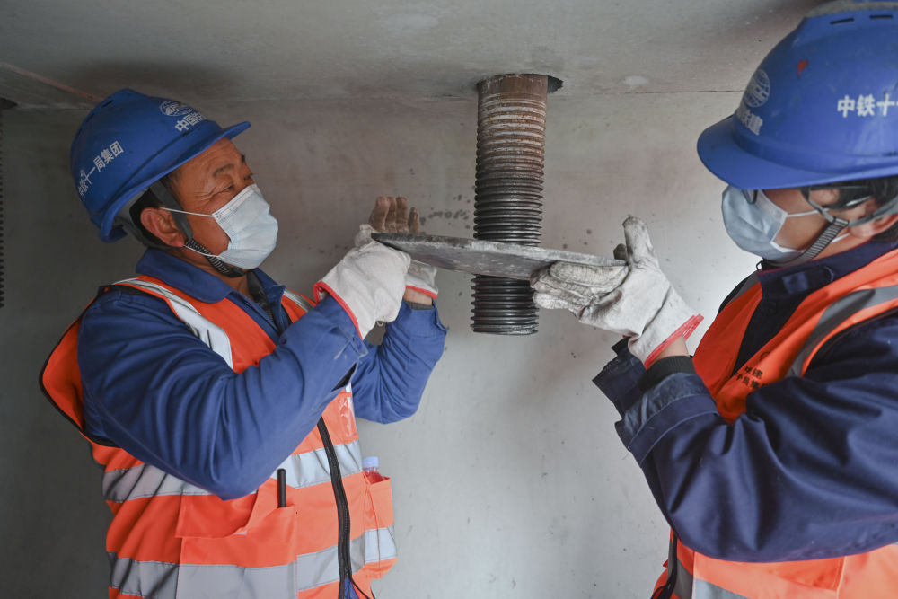 1月28日,杜學(xué)剛(前)和工友在進(jìn)行提梁前對孔作業(yè)。