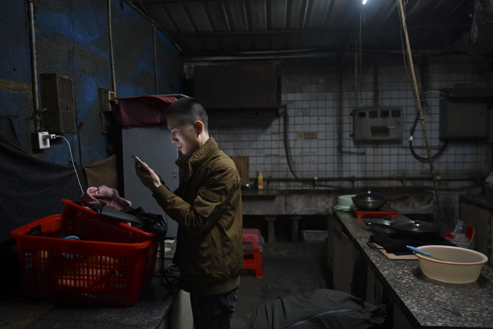 1月26日,黃海龍在廚房用手機(jī)查看剛剛收到的工資明細(xì)。這一年他們夫妻每天工作超過12小時,收入合計約16萬。