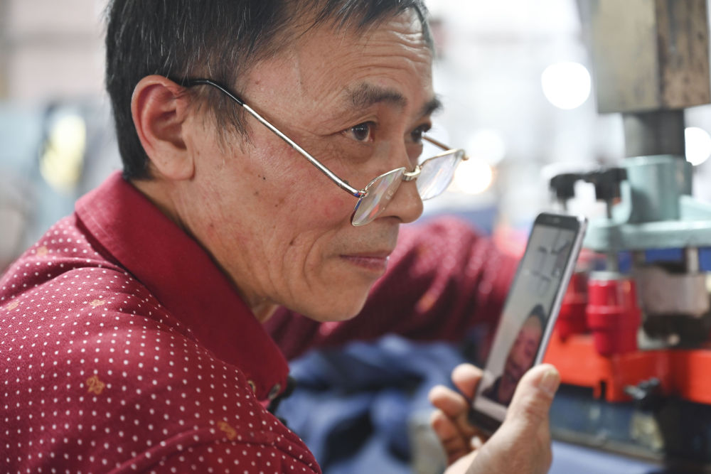 1月25日,在福建省福州市閩侯縣的億格戶外用品有限公司生產(chǎn)車間,四川籍計件工人張良國在休息時與大兒子視頻通話。