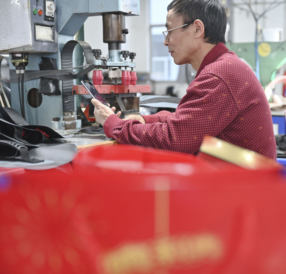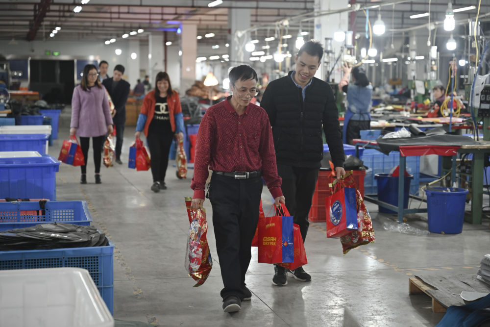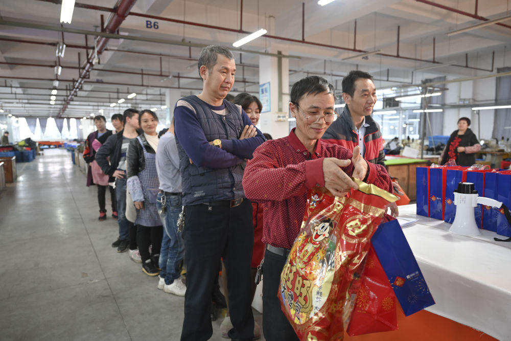 在工廠工作了十多年的張良國將領(lǐng)到的年貨拍成照片,發(fā)給遠(yuǎn)在四川老家的兒子,告訴家人這里一切都好。