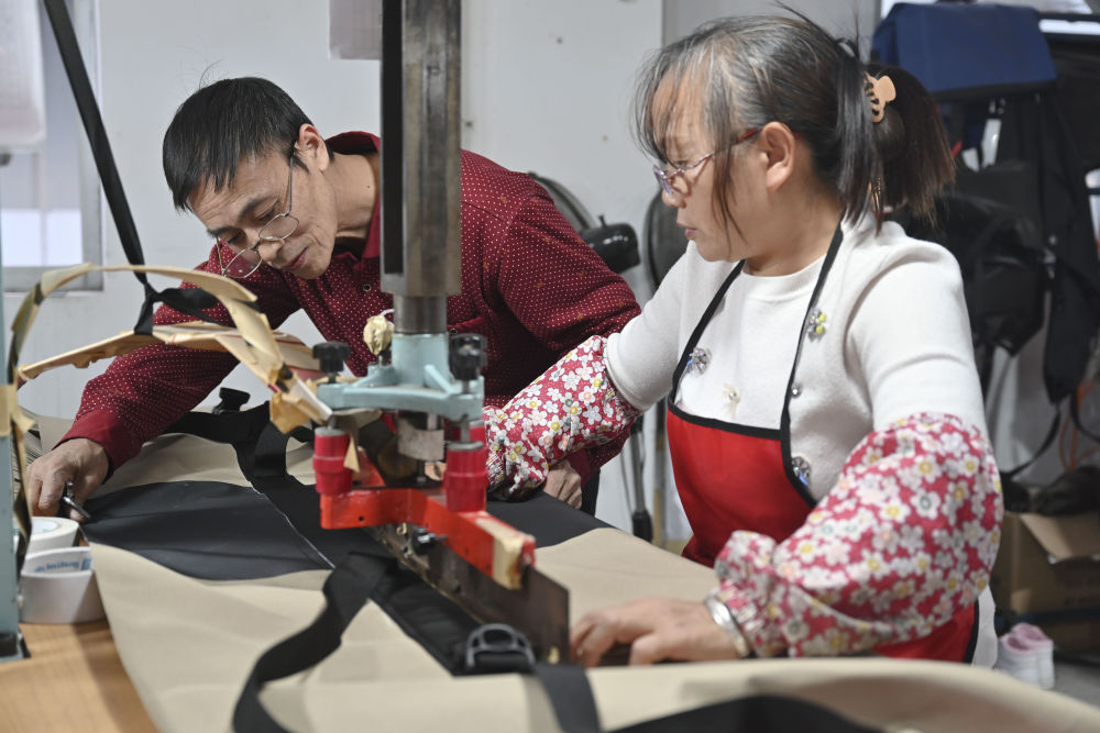 1月25日,張良國和妻子黃遠(yuǎn)玲一起加工防水包。