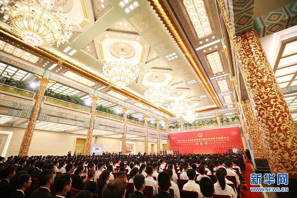 ??? 9月29日上午10時(shí),中華人民共和國(guó)國(guó)家勛章和國(guó)家榮譽(yù)稱號(hào)頒授儀式在人民大會(huì)堂隆重舉行。圖為頒授儀式現(xiàn)場(chǎng)。新華網(wǎng) 陳杰 攝