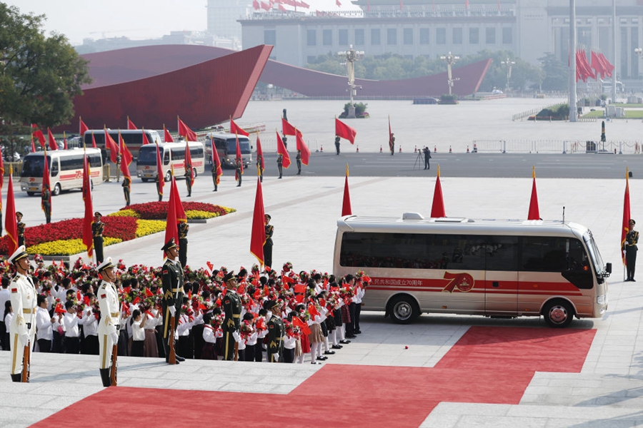 29日上午,國(guó)家勛章和國(guó)家榮譽(yù)稱號(hào)獲得者集體乘坐禮賓車從住地出發(fā),在英姿颯爽的國(guó)賓護(hù)衛(wèi)隊(duì)護(hù)衛(wèi)下,匯成一列車隊(duì),向人民大會(huì)堂進(jìn)發(fā)。