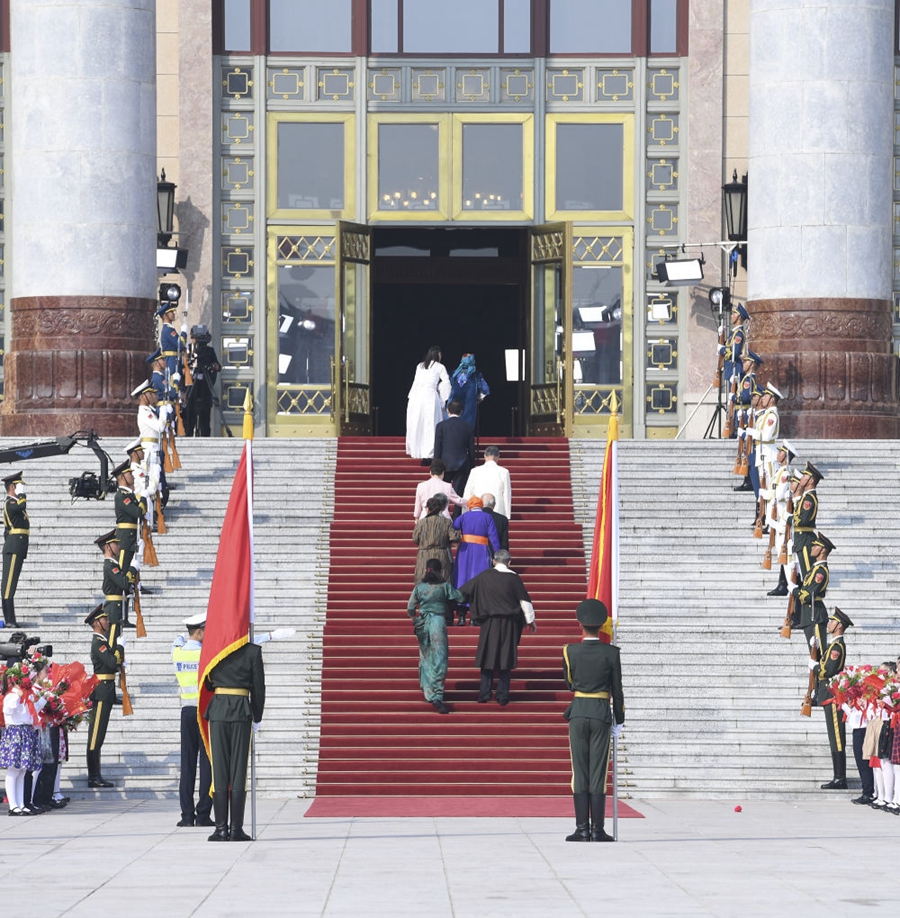 人民大會(huì)堂東門外,高擎紅旗的禮兵分列道路兩側(cè),肩槍禮兵在臺(tái)階上莊嚴(yán)佇立。車隊(duì)抵達(dá)時(shí),早已迎候在這里的青少年們迸發(fā)出熱情的歡呼。
