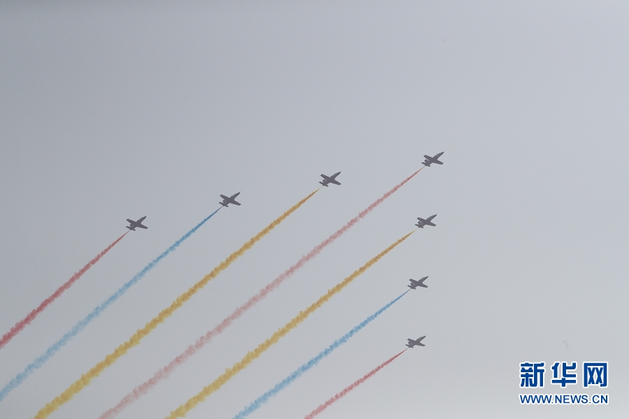 10月1日上午,慶祝中華人民共和國成立70周年大會在北京天安門廣場隆重舉行。這是受閱的空中梯隊。 新華社記者 王曄 攝