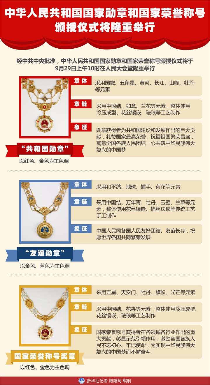 經(jīng)中共中央批準(zhǔn),中華人民共和國國家勛章和國家榮譽(yù)稱號(hào)頒授儀式將于9月29日上午10時(shí)在北京人民大會(huì)堂隆重舉行。 這是“友誼勛章”。 新華社發(fā)