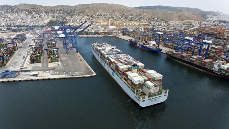 這是2017年5月7日,中遠(yuǎn)海運(yùn)的貨船駛出比雷埃夫斯港(比港)集裝箱碼頭。 新華社發(fā)(帕諾斯·托馬達(dá)基斯 攝)