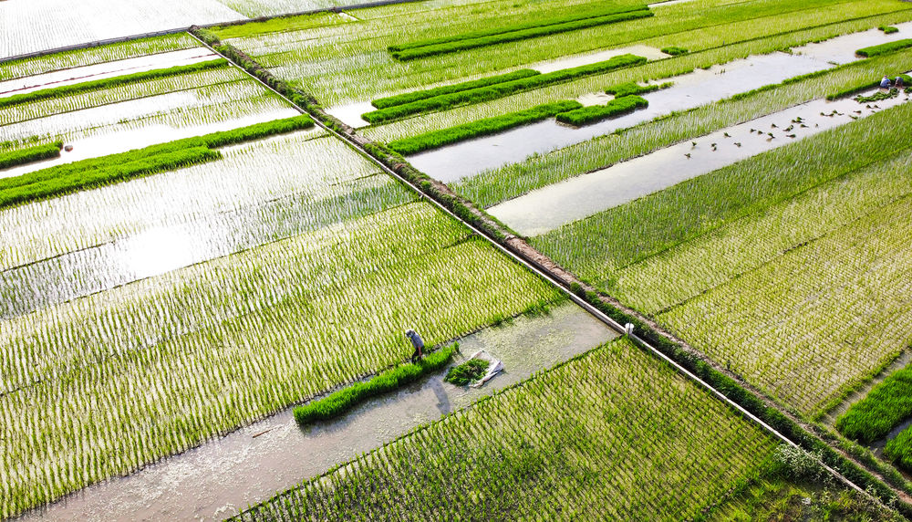 2020年6月14日,農(nóng)民在洛陽市孟津縣會盟鎮(zhèn)黃河岸邊的萬畝優(yōu)質(zhì)水稻種植示范基地內(nèi)移栽水稻秧苗(無人機(jī)照片)。新華社發(fā)(黃政偉 攝)