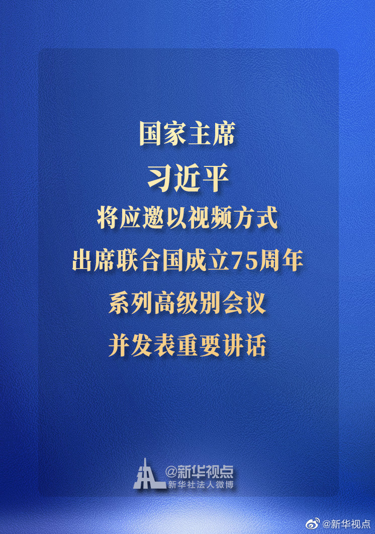 外交部發(fā)言人華春瑩15日宣布:國(guó)家主席習(xí)近平將應(yīng)邀以視頻方式出席聯(lián)合國(guó)成立75周年系列高級(jí)別會(huì)議并發(fā)表重要講話。?