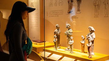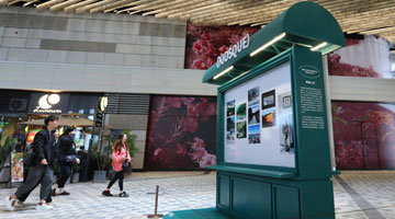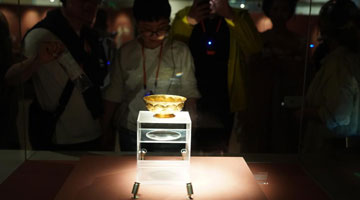 陈银付在介绍自己带来的瓷刻作品《棋乐融融》(5月8日摄)。