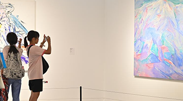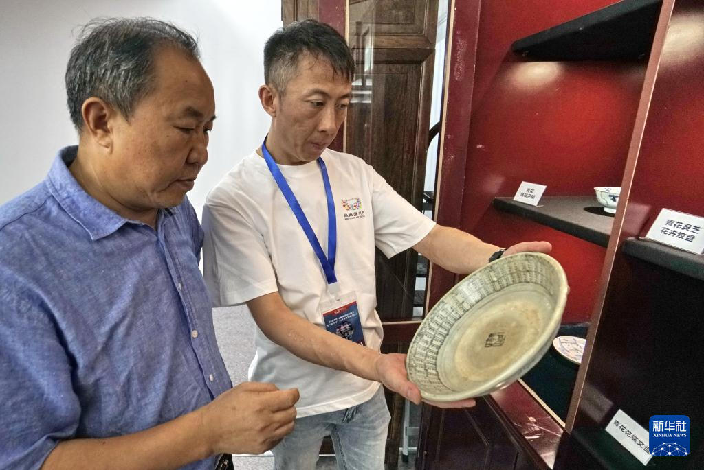 8月31日,海洋文化专家朱瑞良(左)在展览现场研究打捞出水的清代瓷器图案。
