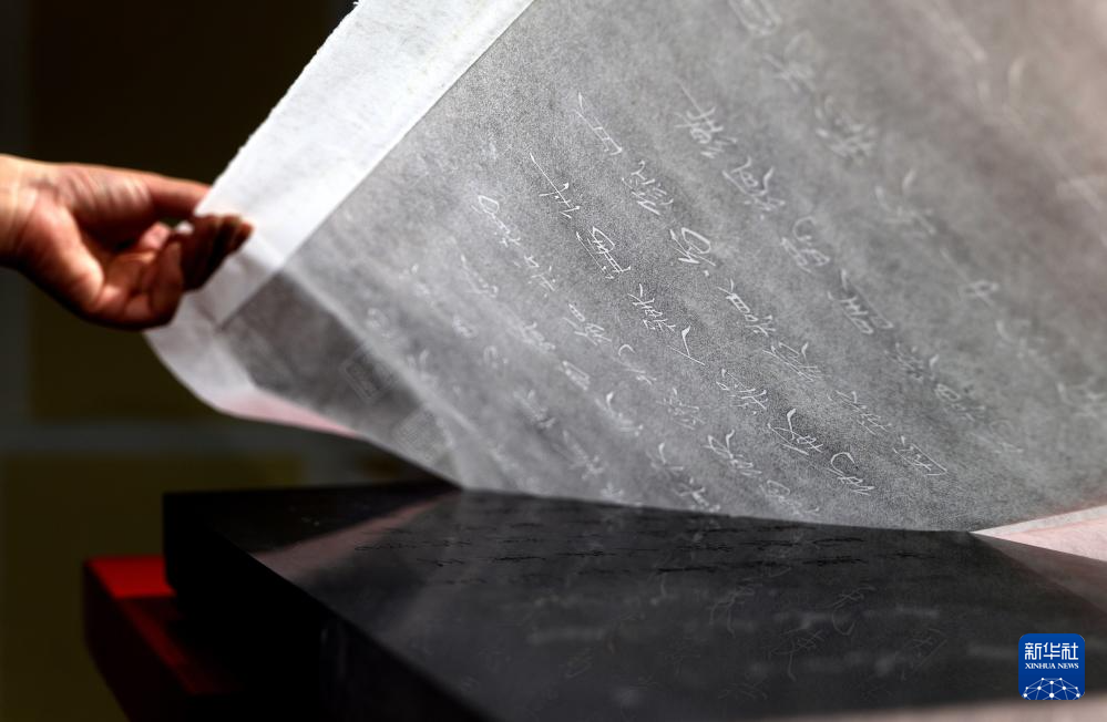 在洛阳华夏金石文化博物馆,钱夏玉将拓印完成的金石拓片揭下(9月11日摄)。