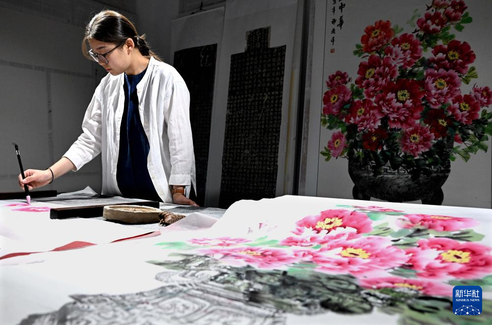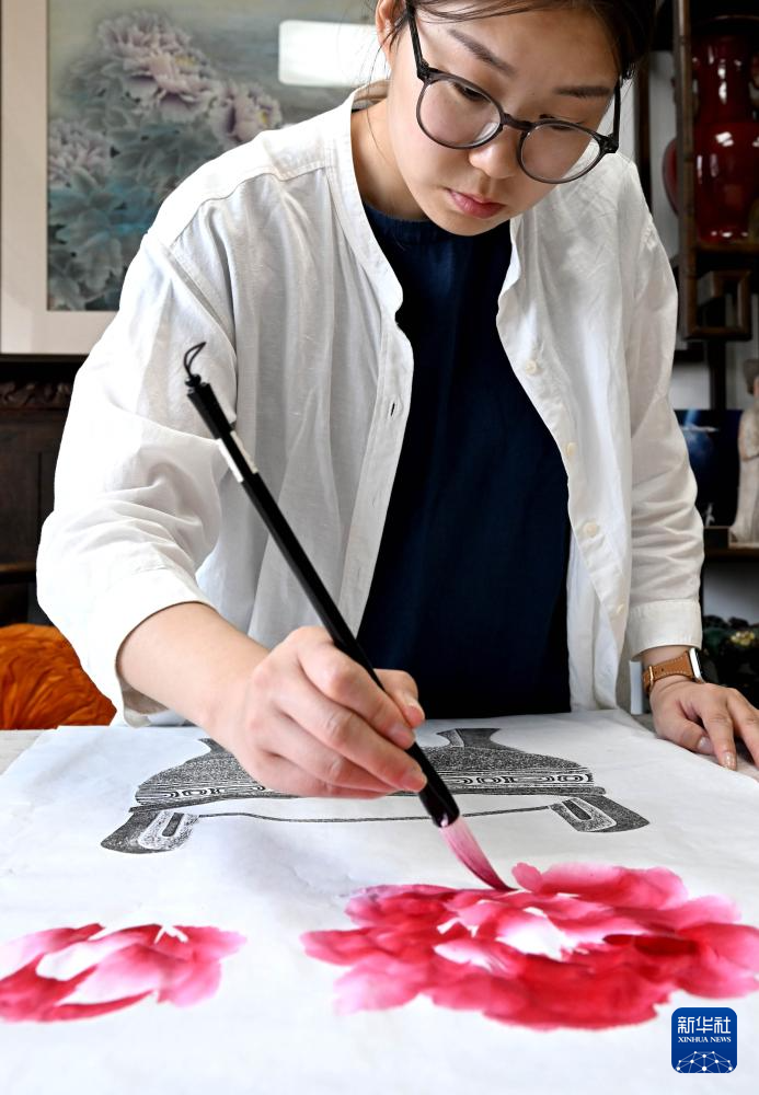 在洛阳龙门画院,钱夏玉在拓印完成的金石拓片上补绘牡丹画(9月11日摄)。